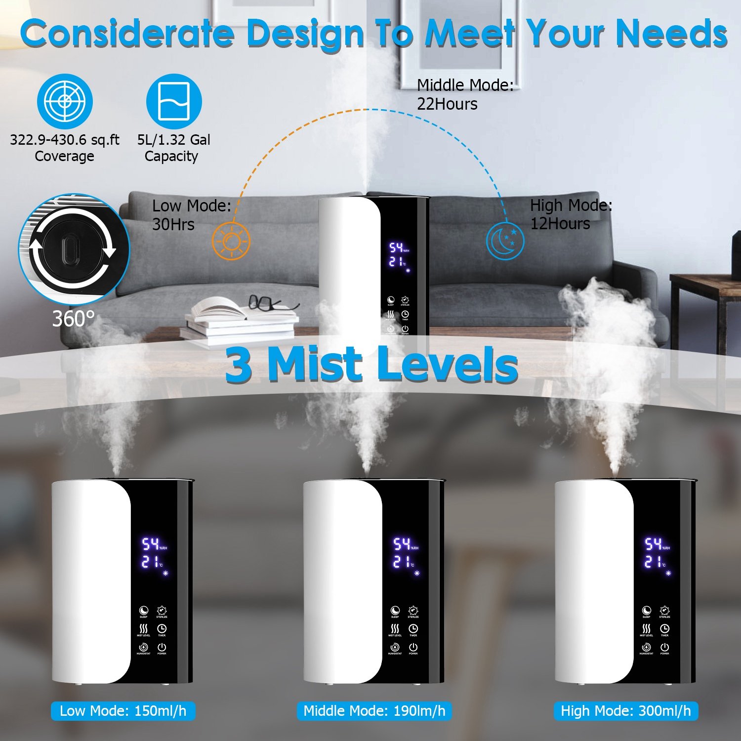 5L/1.32Gal Humidifiers Top Fill Cool Mist Humidifier with Essential Oils Diffuser Filter 360° Rotatable Outlet Nozzle 1-8 Hours Timer 1-3 Level Mist 4
